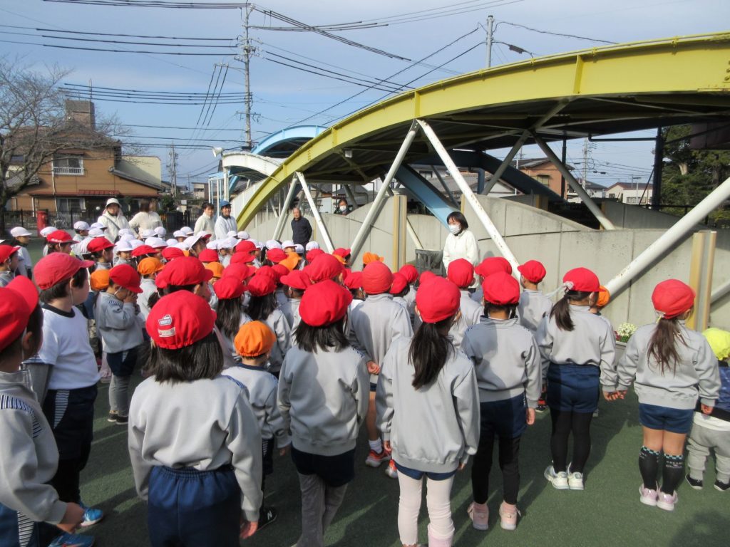 園長先生からお話をいただいた後、きりん組さん、うさぎ組さんは小さいクラスの子どもたちと手をつなぎ、出発です!