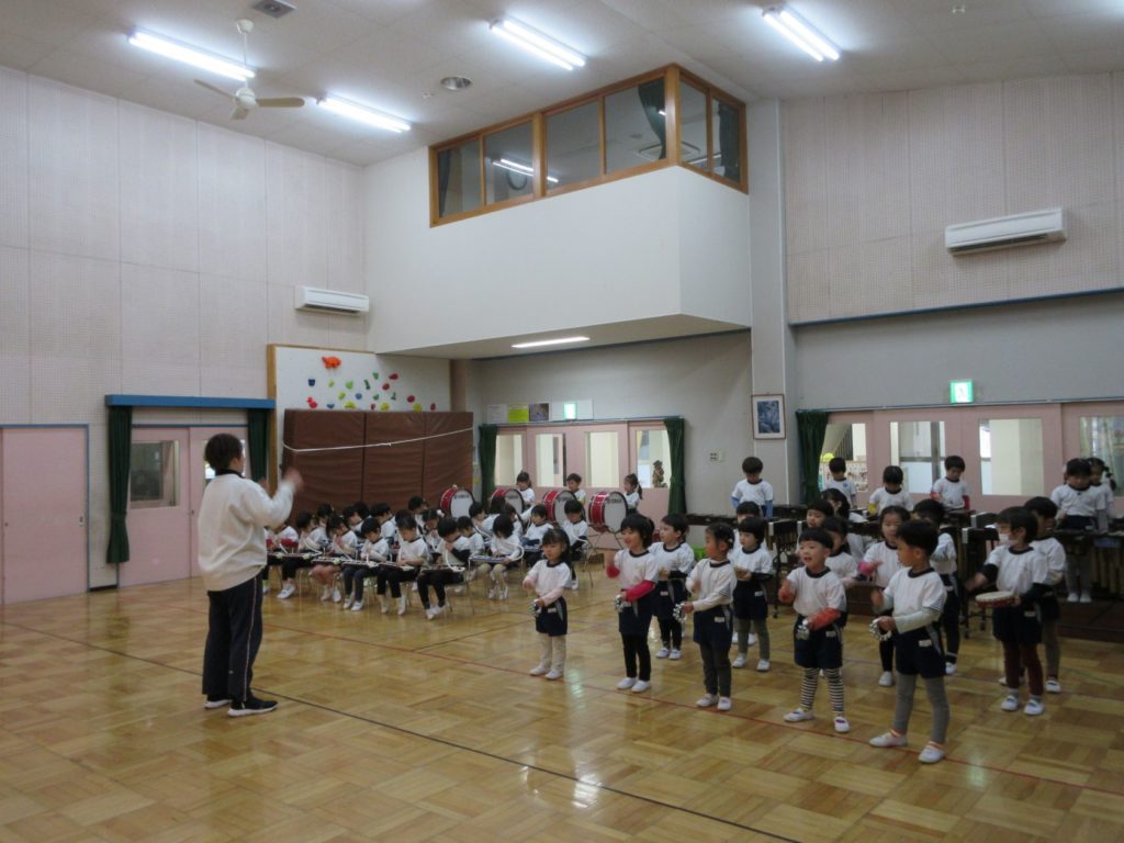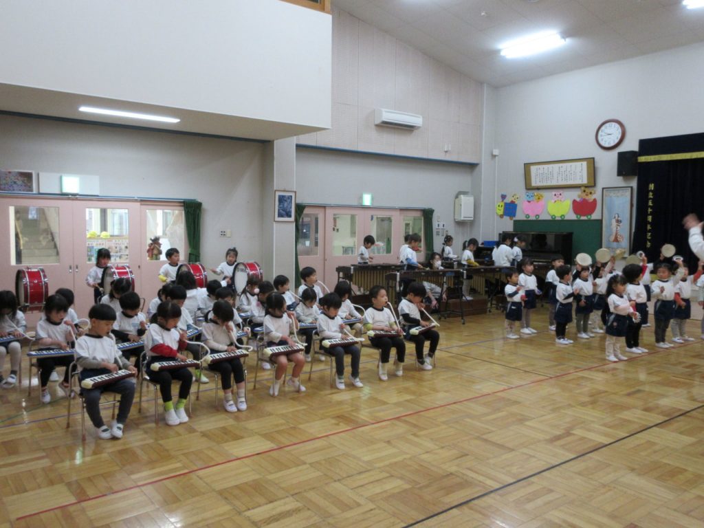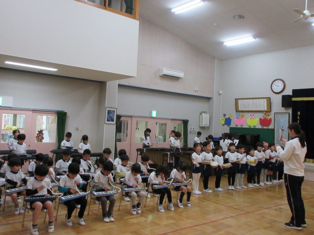 りす組さんは、「ぶんぶんぶん」「きらきら星」の曲にあわせて合奏をしました。