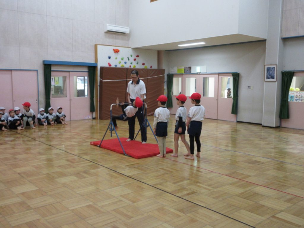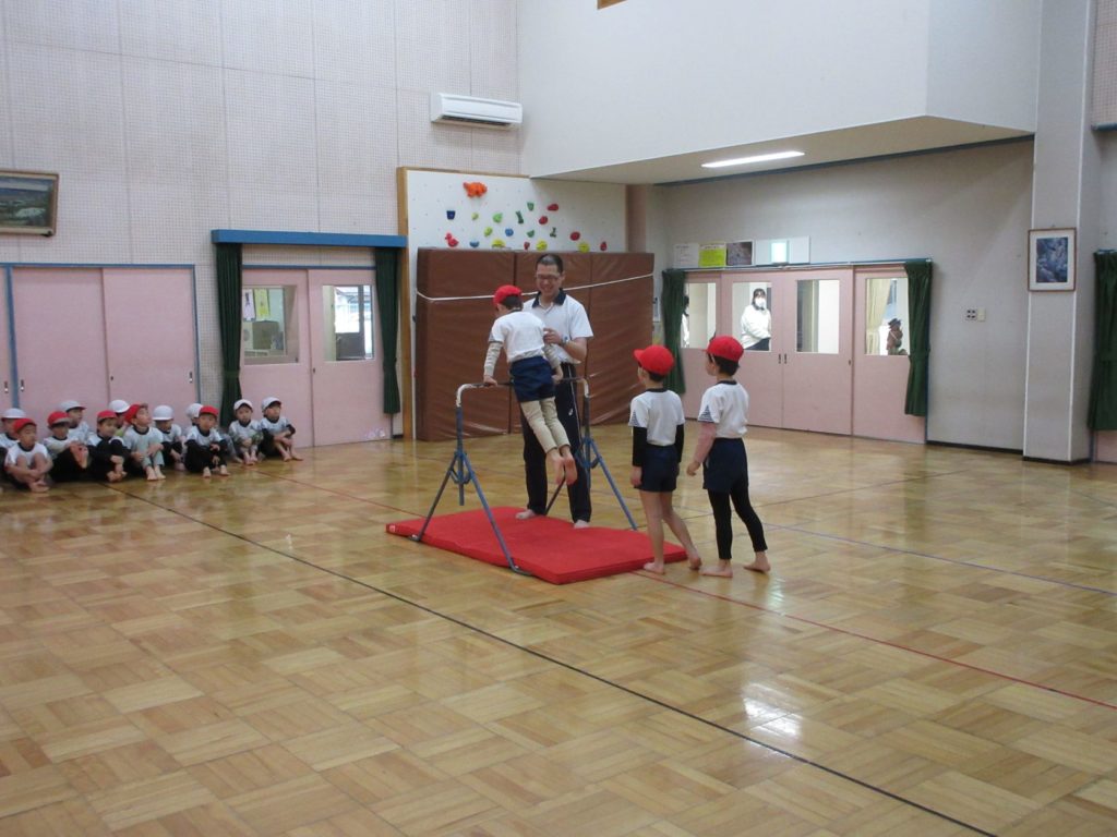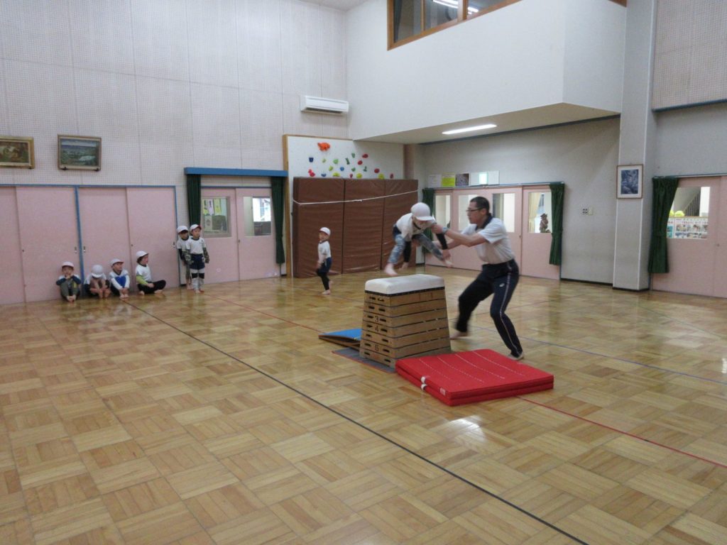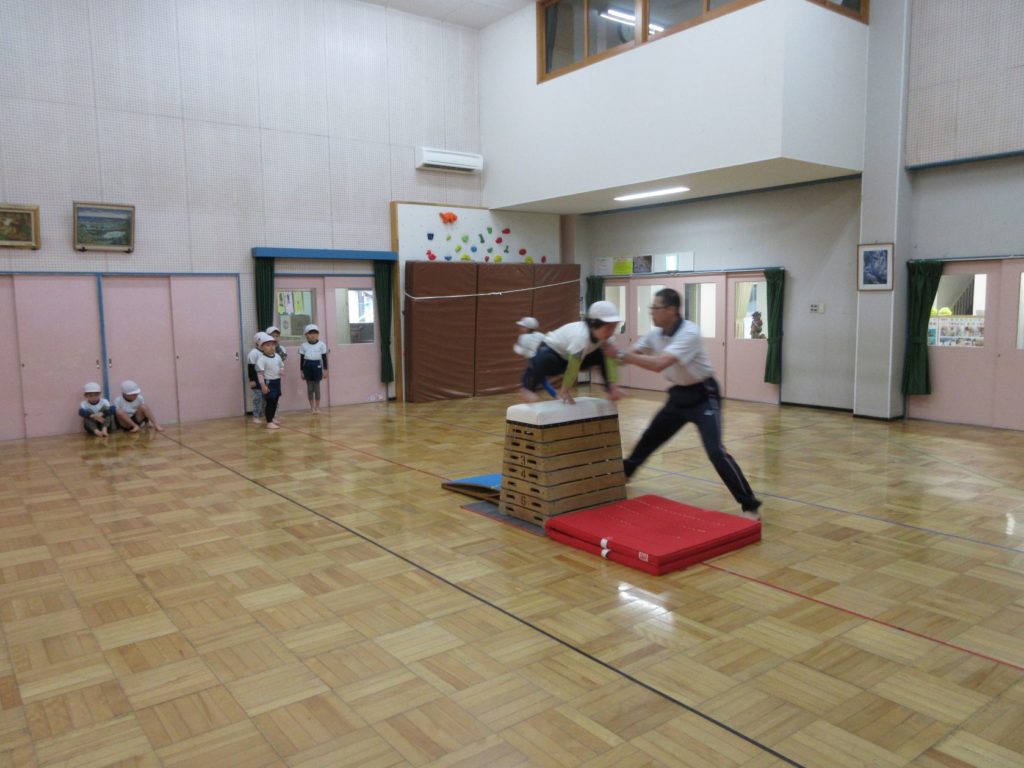 きりん組の男の子は、逆上がりやマット、跳び箱に挑戦!