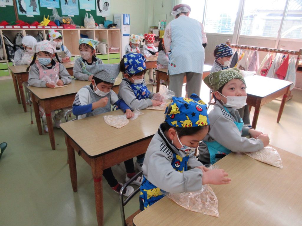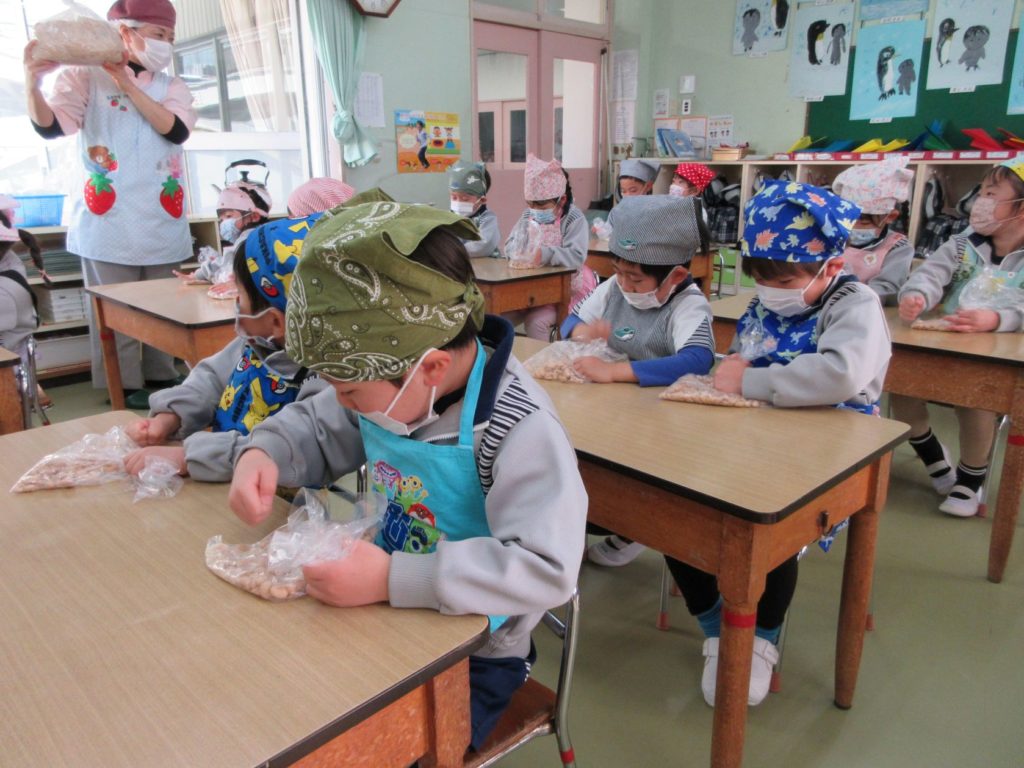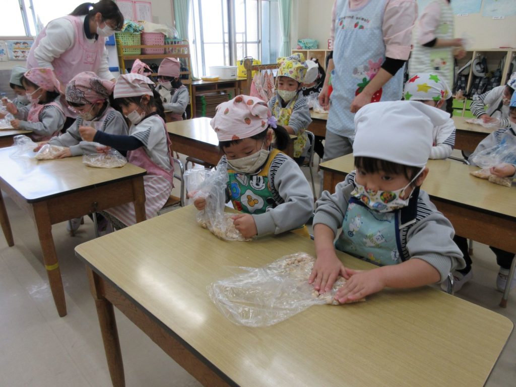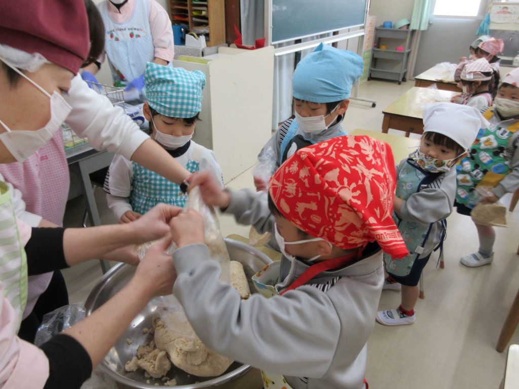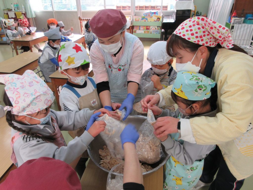 今日はうさぎ組さんの食育で、みそ作りがありました。