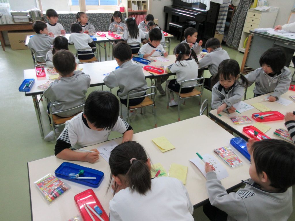 りす組さん、うさぎ組さんはお友だちに手紙を書いて、楽しんでいます。