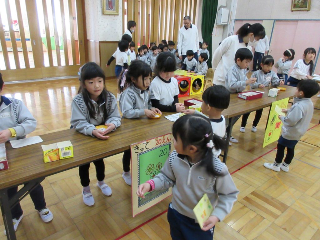 りす組さんやうさぎ組さんが買い物に来てくれると、少し緊張しながらも優しく対応してくれていたきりん組さん。