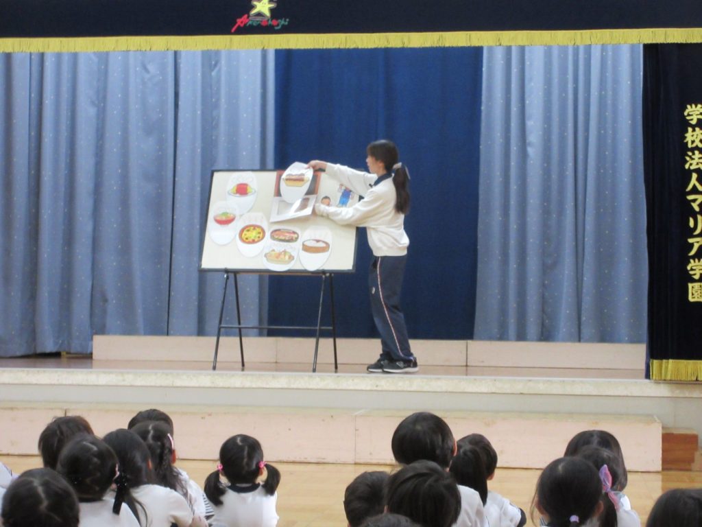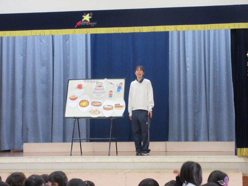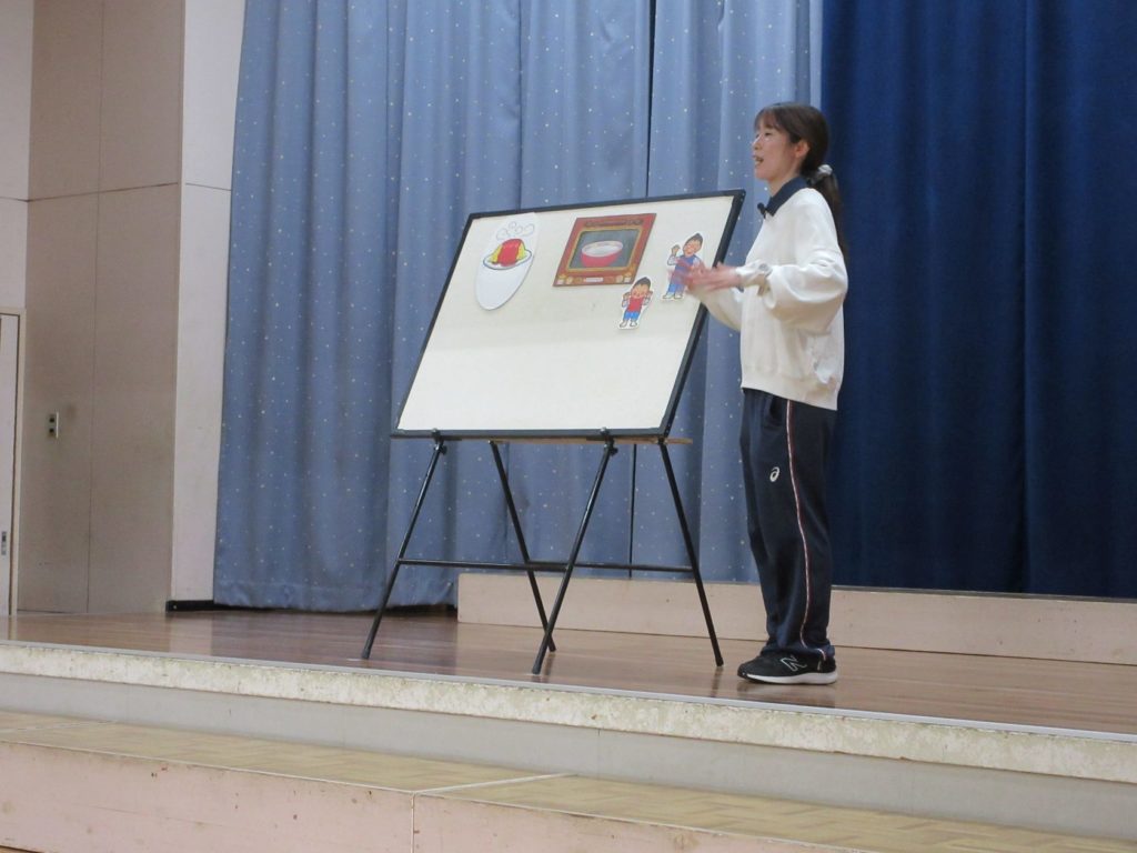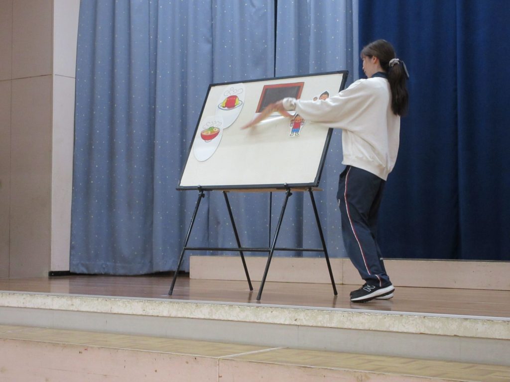 先生からのプレゼントは、パネルシアター「まほうのでんしレンジ」でした。