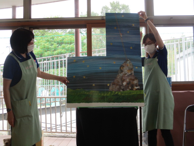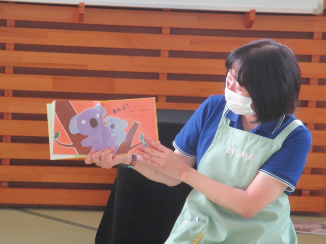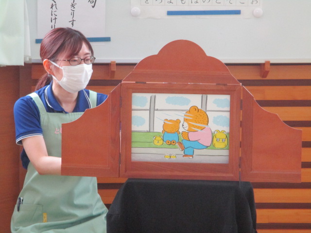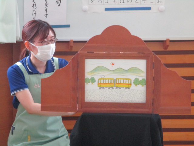 つくし、たんぽぽ組では、紙芝居「がらがらでんしゃ」を読んでいただきました。
