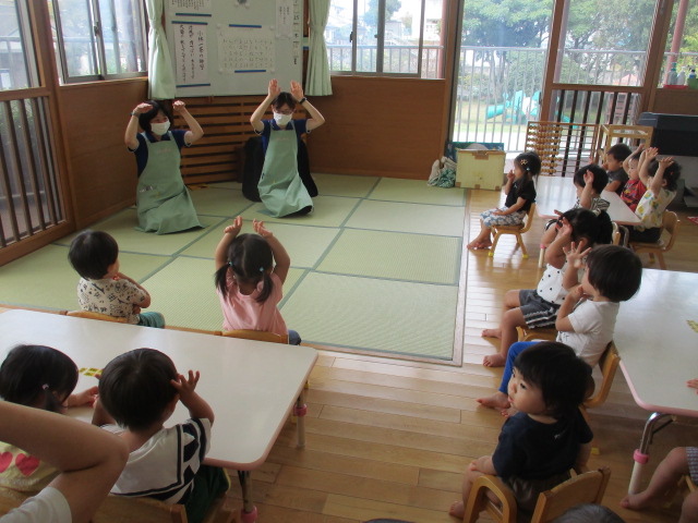 手あそびうた♪パンダうさぎコアラも知ってるよ~!とはりきって参加!スピードがアップすると大忙しでしたが、笑顔もたくさんみられました。