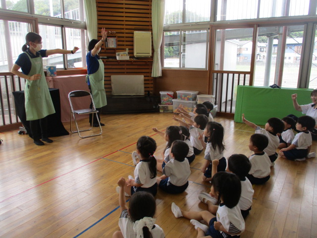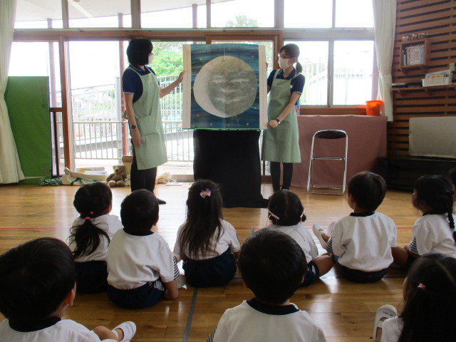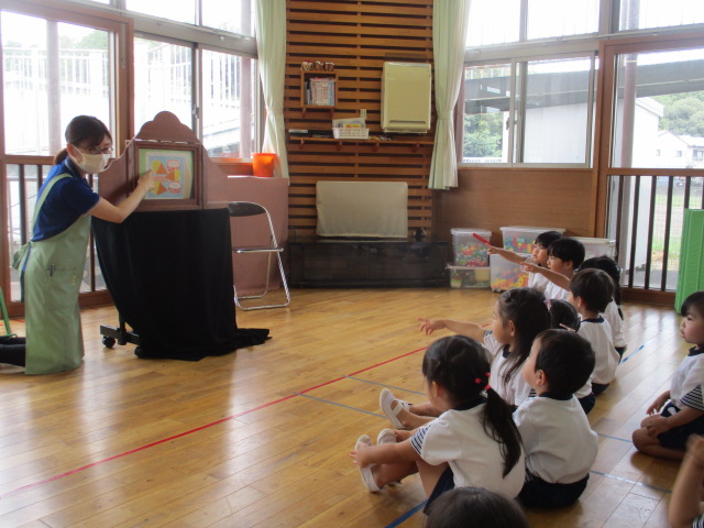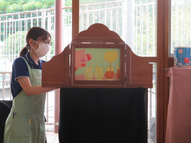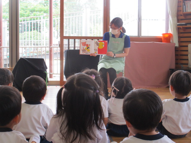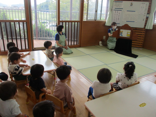 ひまわり組では、「くいしんぼうおばけ」の紙芝居で大好きなおばけが登場し、「おばけだー!」と大喜びの子どもたちでした。ブタローさんの食べ物をつまみぐいするくいしんぼうおばけのパックンを「どこにいるかな?」と探し、楽しんでいましたよ!