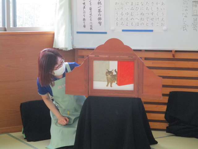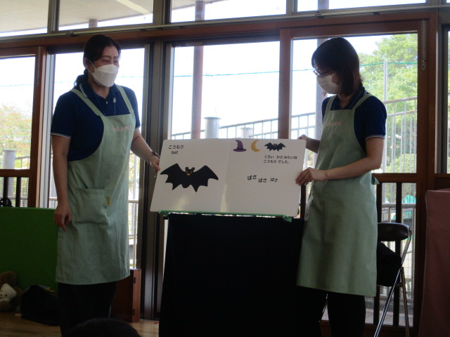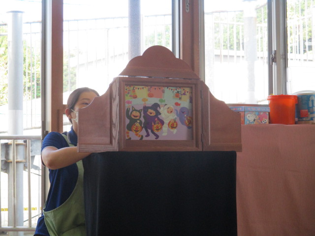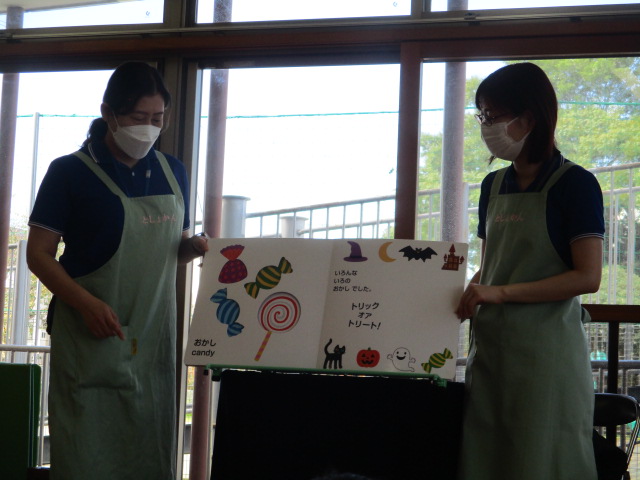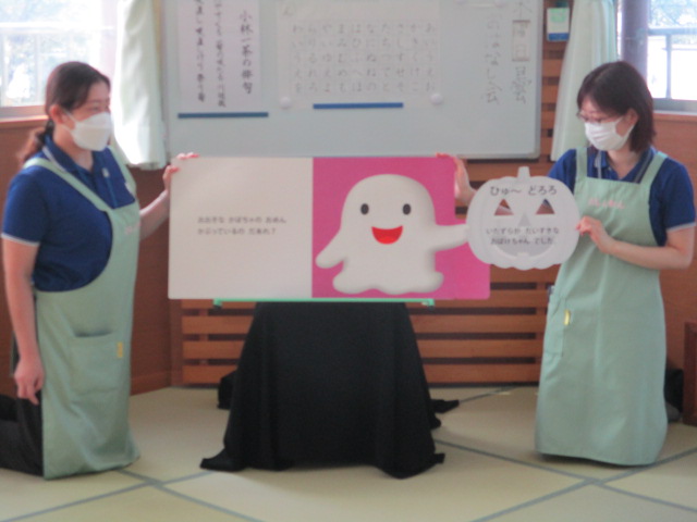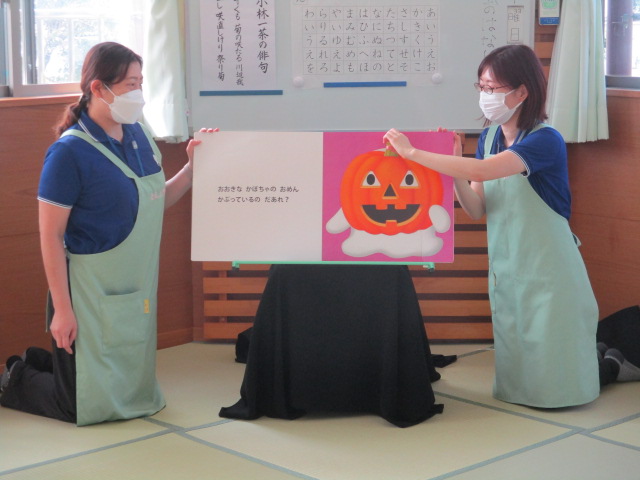 紙芝居「みーちゃんでておいでー」では、繰り返し出てくる「みーちゃんでておいでー」を真似したり、ネコのみーちゃんを見つけると「こっちー」と、嬉しそうに指差しして教えてくれる子もたくさんいました。大型絵本の「おめんです」では、お面をつけている動物さんたちを想像して発言していました。かぼちゃのお面をかぶったおばけちゃんの登場には、ハロウィンをテーマにした「かぼちゃのだいおう」の絵本の中にも出てきたので、「さっきも見たよ~」と、大喜びでした。