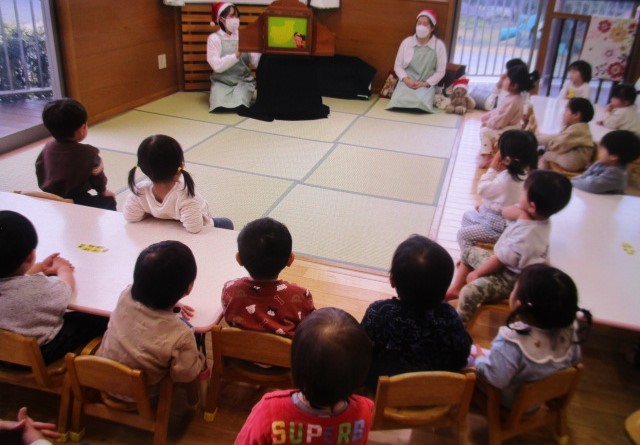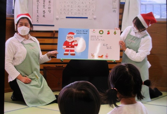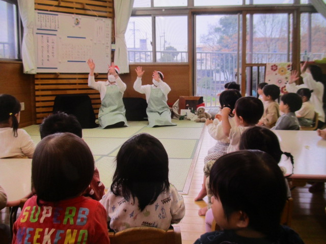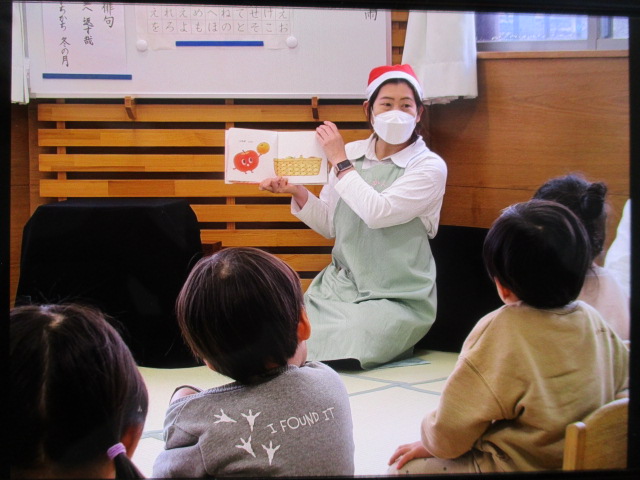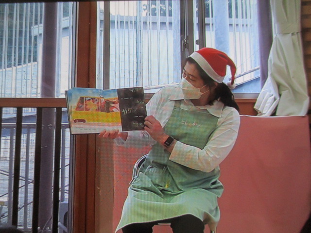また、「まどから おくりもの」や「がんばれサンタさん」など、クリスマスにちなんだ絵本、紙芝居も読んでいただき、「サンタさんだー!!」と大喜びの子どもたちでした。