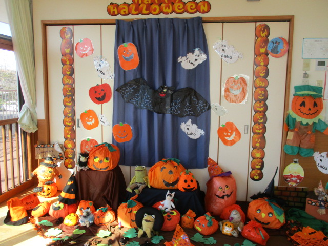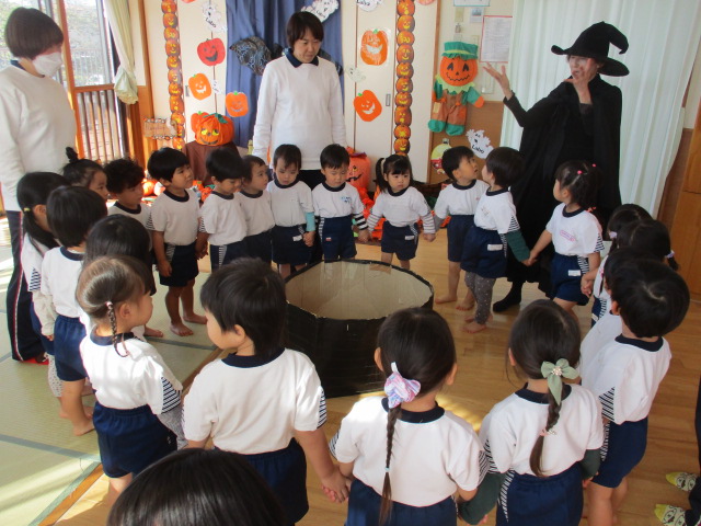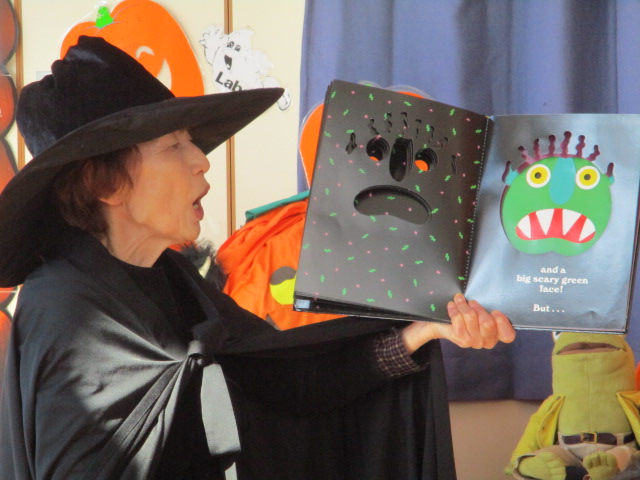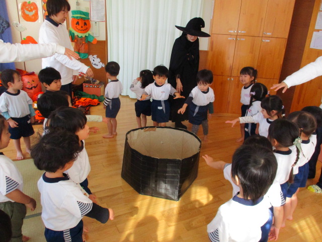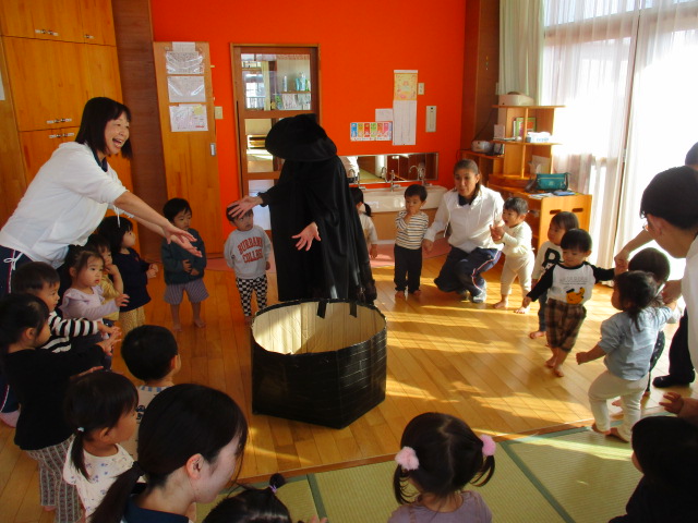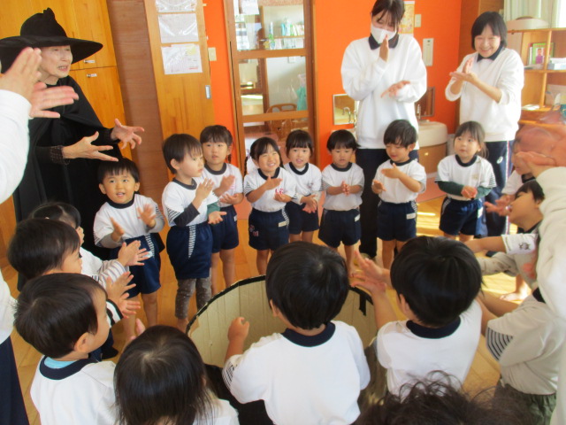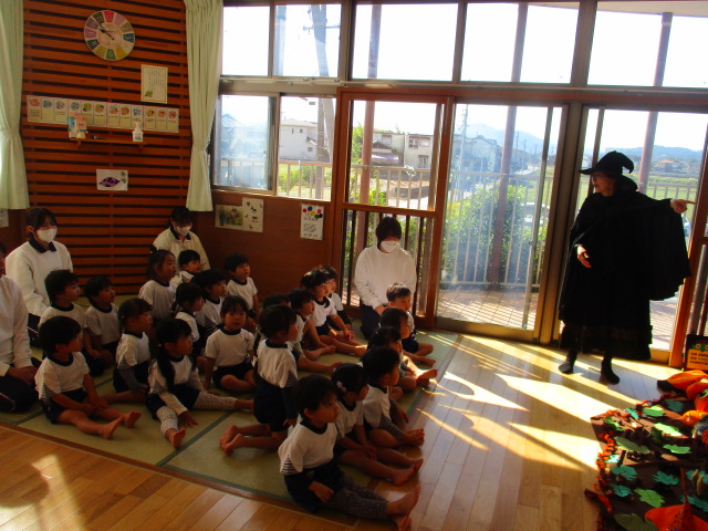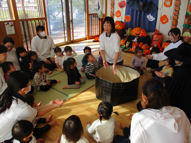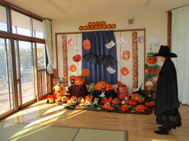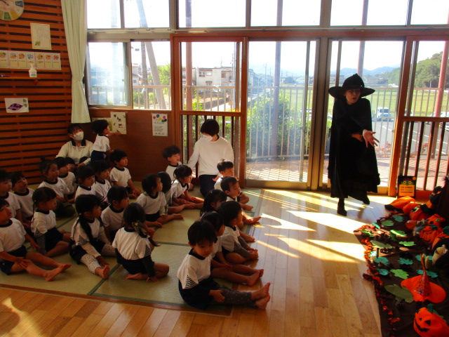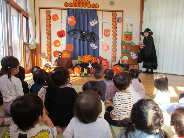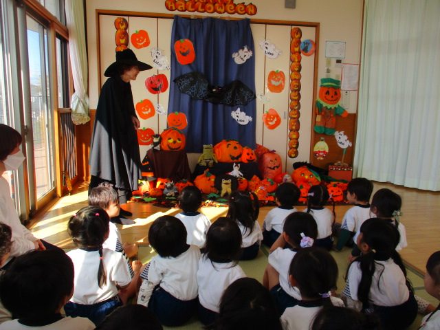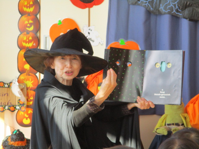会場となったお部屋では、カボチャやおばけたちが飾られ・・・いつもと違う雰囲気にびっくりして周りをきょろきょろしている子どもたち!!魔女に扮した講師の井本先生が、一つ一つ紹介してくれるのを身を乗り出すようにして、嬉しそうに見聞きしていましたよ。