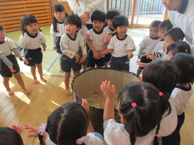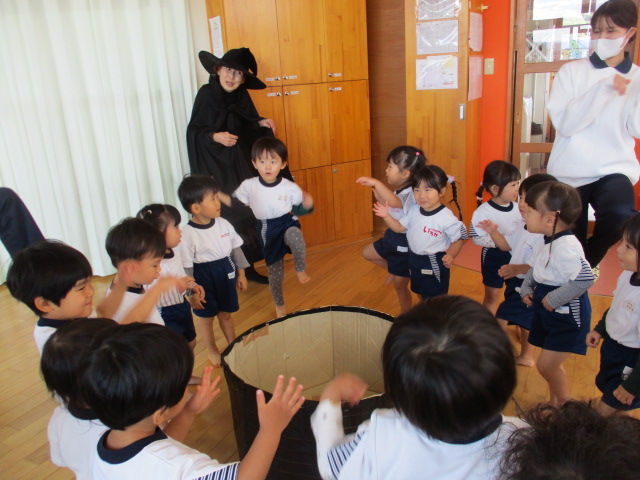 魔女のスープ作りのダンスでは、みんなで中に入れる材料を考え、コーン、かぼちゃ、にんじん、ベーコンなどを入れてぐるぐるぐる・・・おいしいスープが出来ました。「おいしい!」とスープを飲む真似を楽しんでいました。