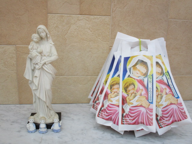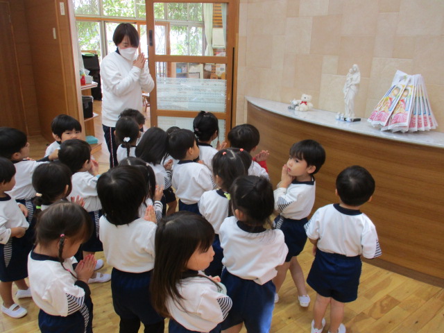 2025/11/14 七五三祝福 今日は神父様にお越しいただき、本町園舎ホールにて七五三の祝福の会がありました。 ひまわり組さんが参加して、子どもたち一人ひとりがこれからも元気に大きく成長できますようにとお祈り、祝福をしていただきました。