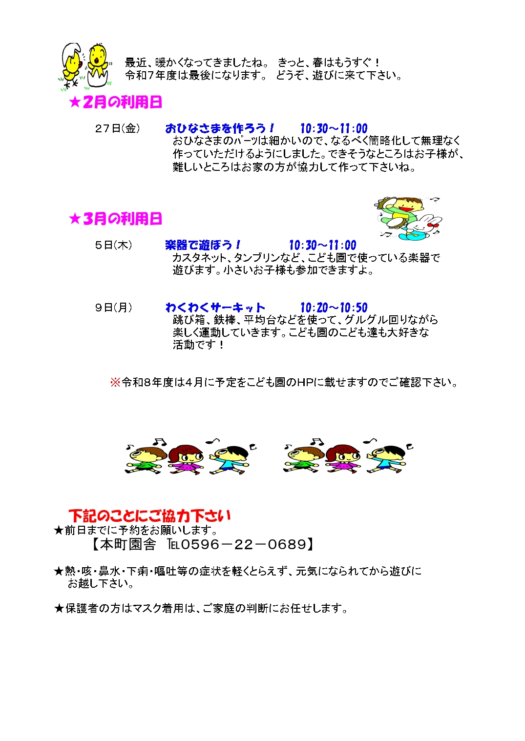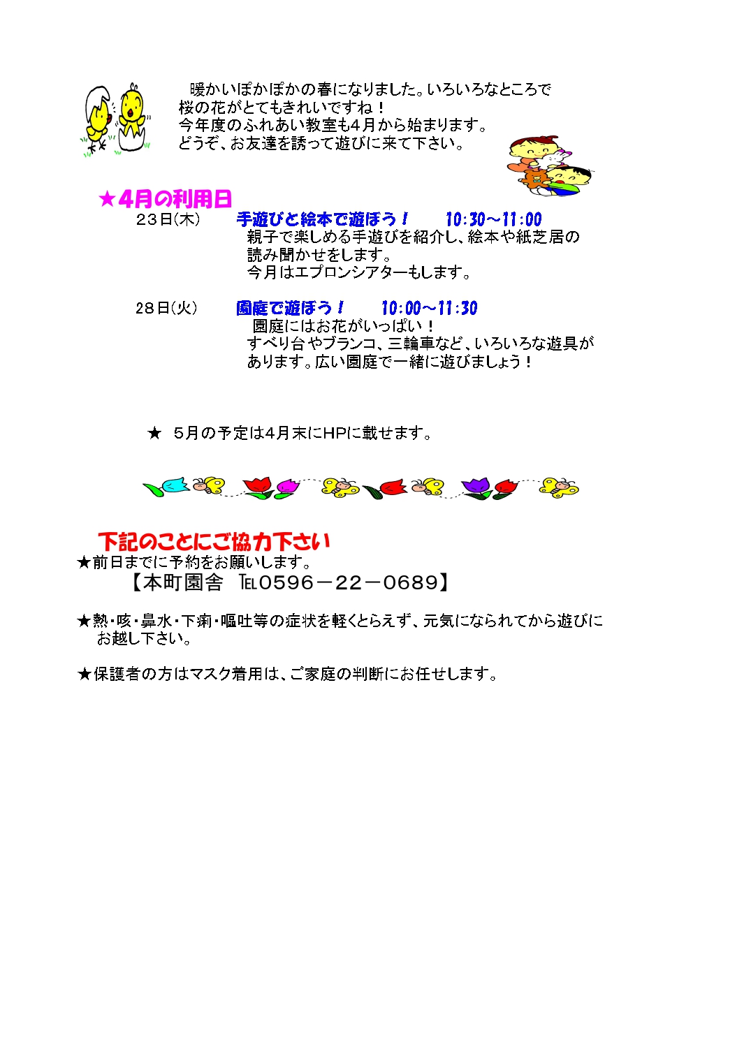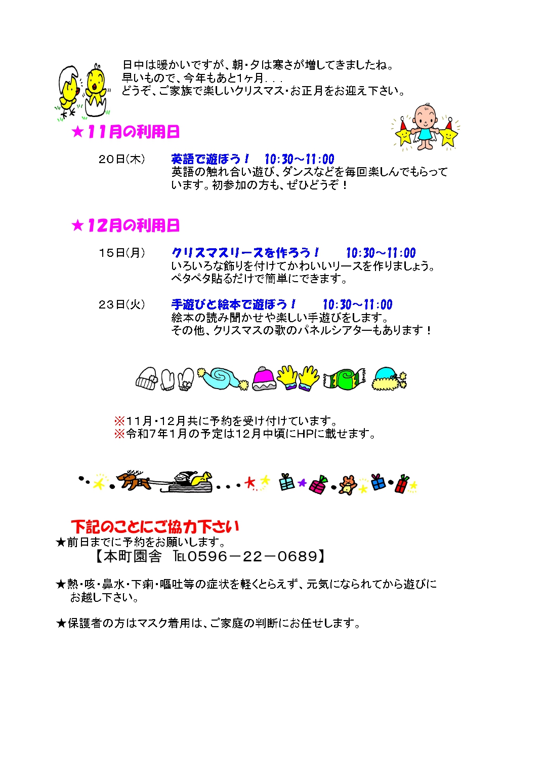 ※毎月2,3回、こども園内の図書室・園庭・わくわくランドを無料開放。